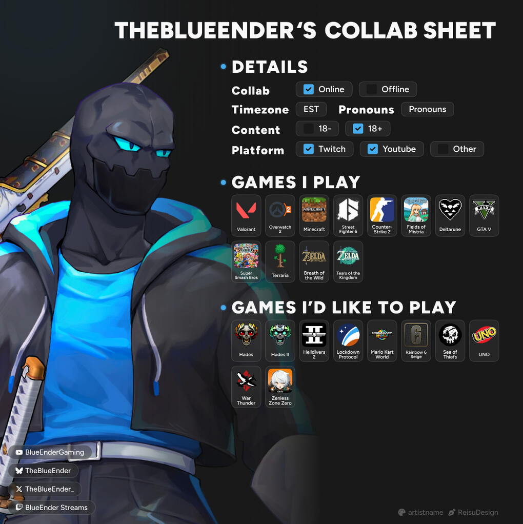 ⚡️Hello everyone! I am TheBlueEnder, your Enderman Vtuber! You can call me Ender or Blue! I'm a variety streamer. I usually stream at 7pm on weekdays and 2pm on weekends (EST). Join me to see everything from funny moments to insane clips! If you want to see my stream schedules then join my Discord⚡